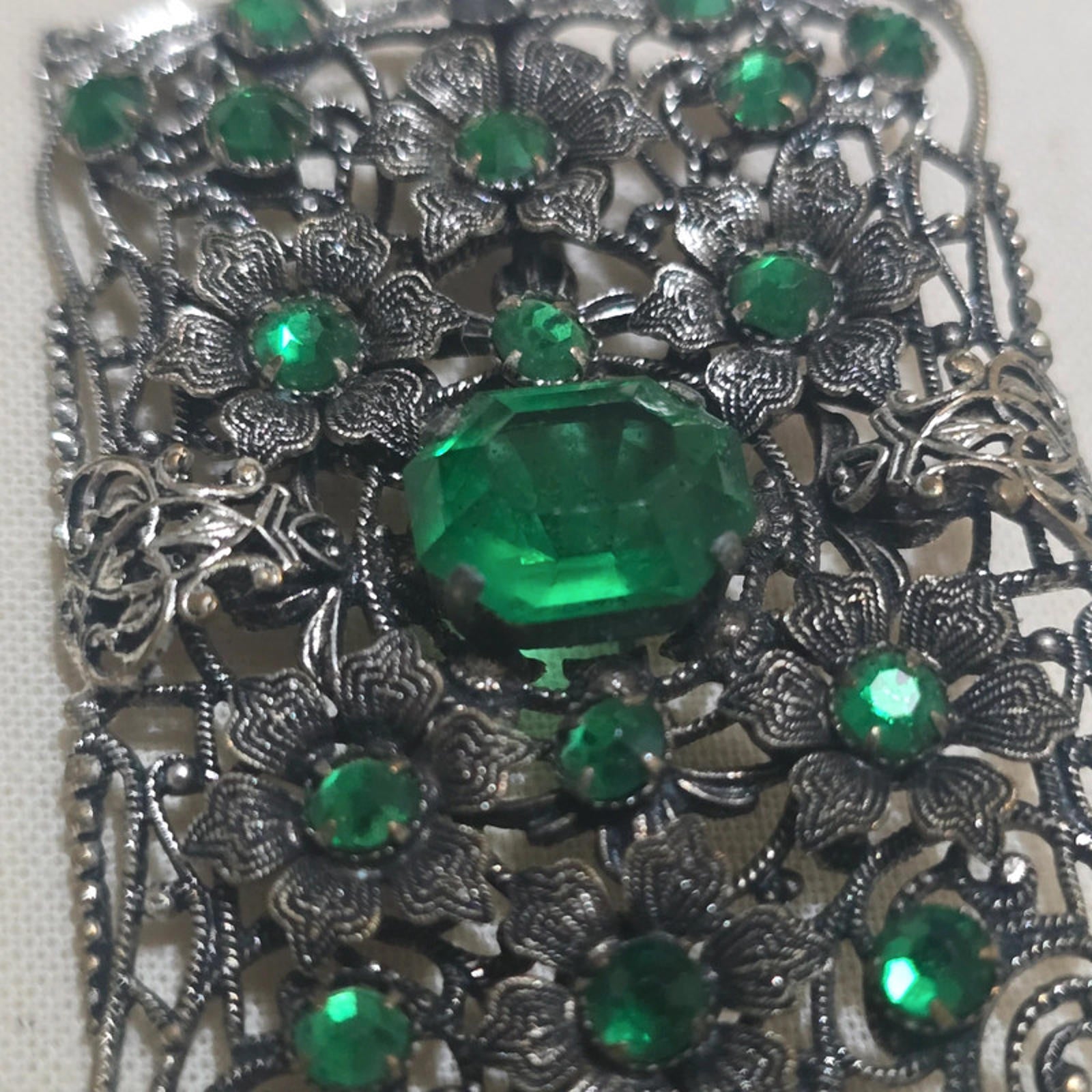a stunning filigree and emerald green vintage brooch