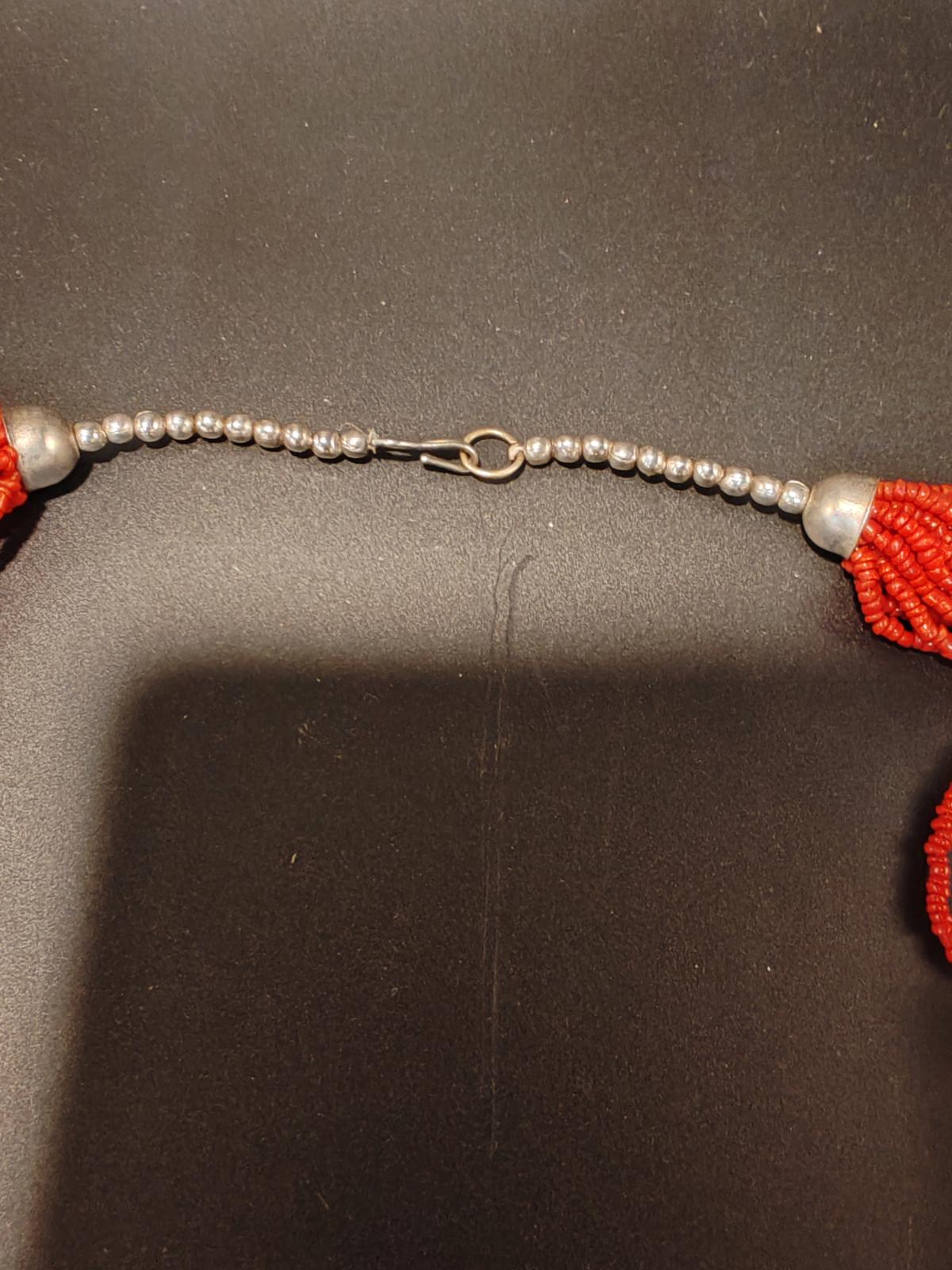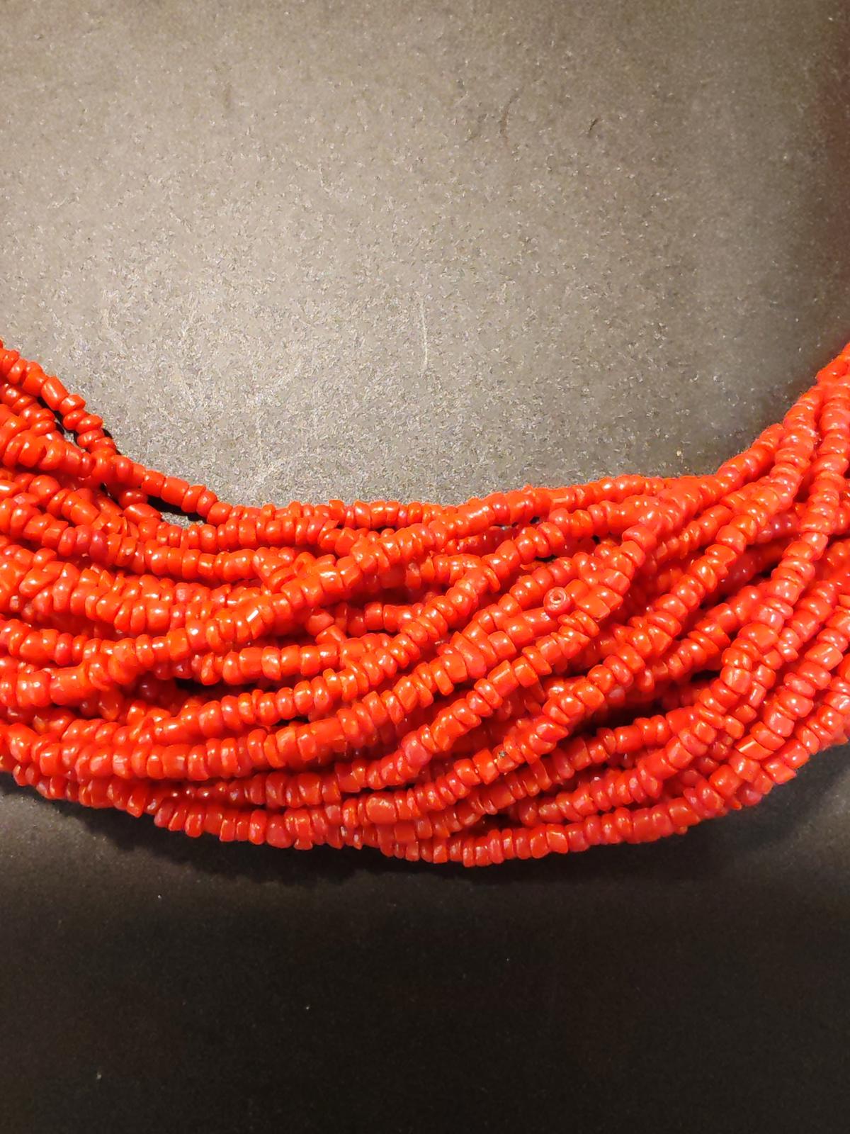 Stylish Tibetan-style Multi-Strand necklace in red and cream carved bone with metal fastening. 34cm long.