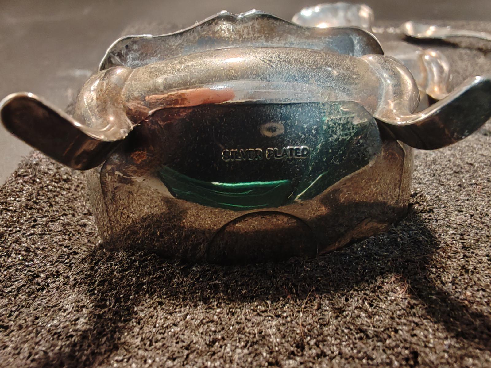 Small Gernadier Silversmiths condiment set. Silverplated & made in England. Bit of tarnish, wear & tear with age. No box but has the box inners. See pictures for details.